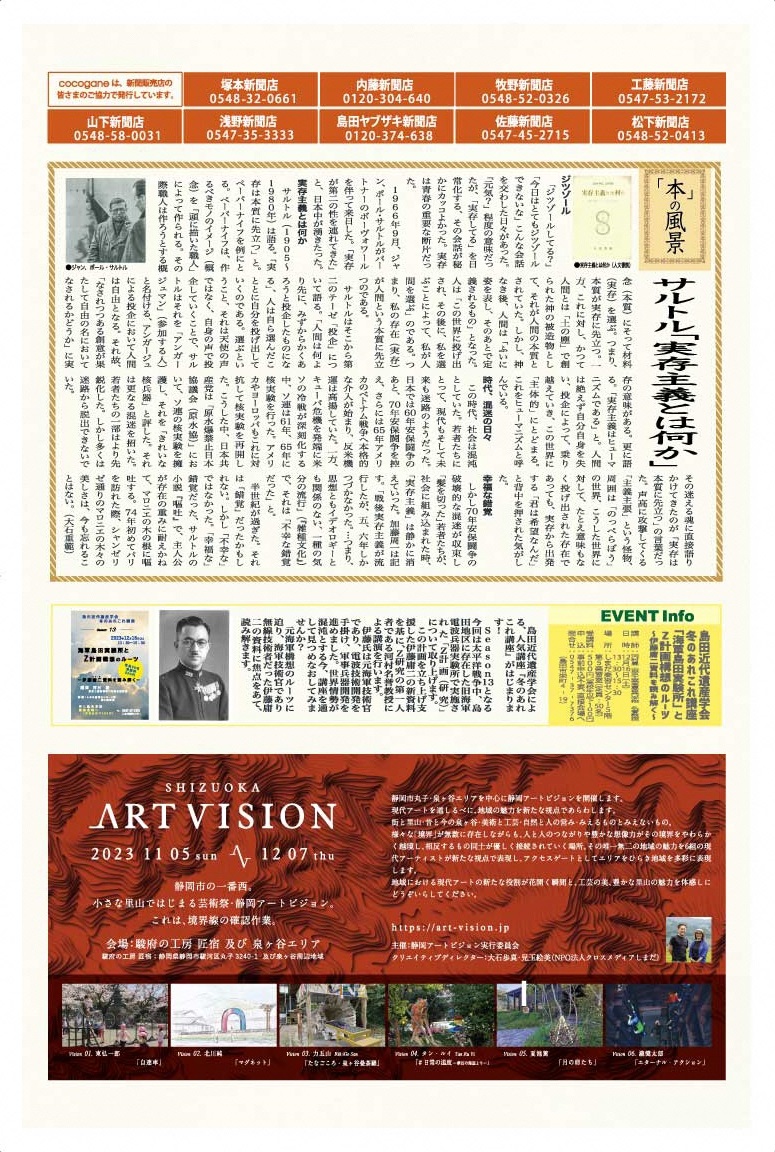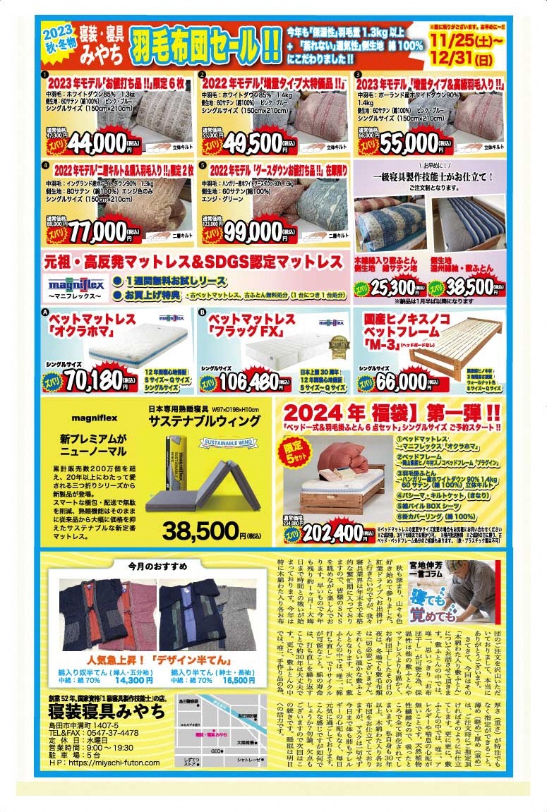 その他、イベントインフォメーションでは、島田近代遺産学会さんの人気のあれこれ講座のご案内や、アーツカウンシルしずおかさんの「空き家×アート」セミナーのご案内、そして毎年恒例の寝装寝具みやちさんの羽毛布団セールの情報とお布団の豆知識満載の「寝ても覚めてコラム」も必見です!