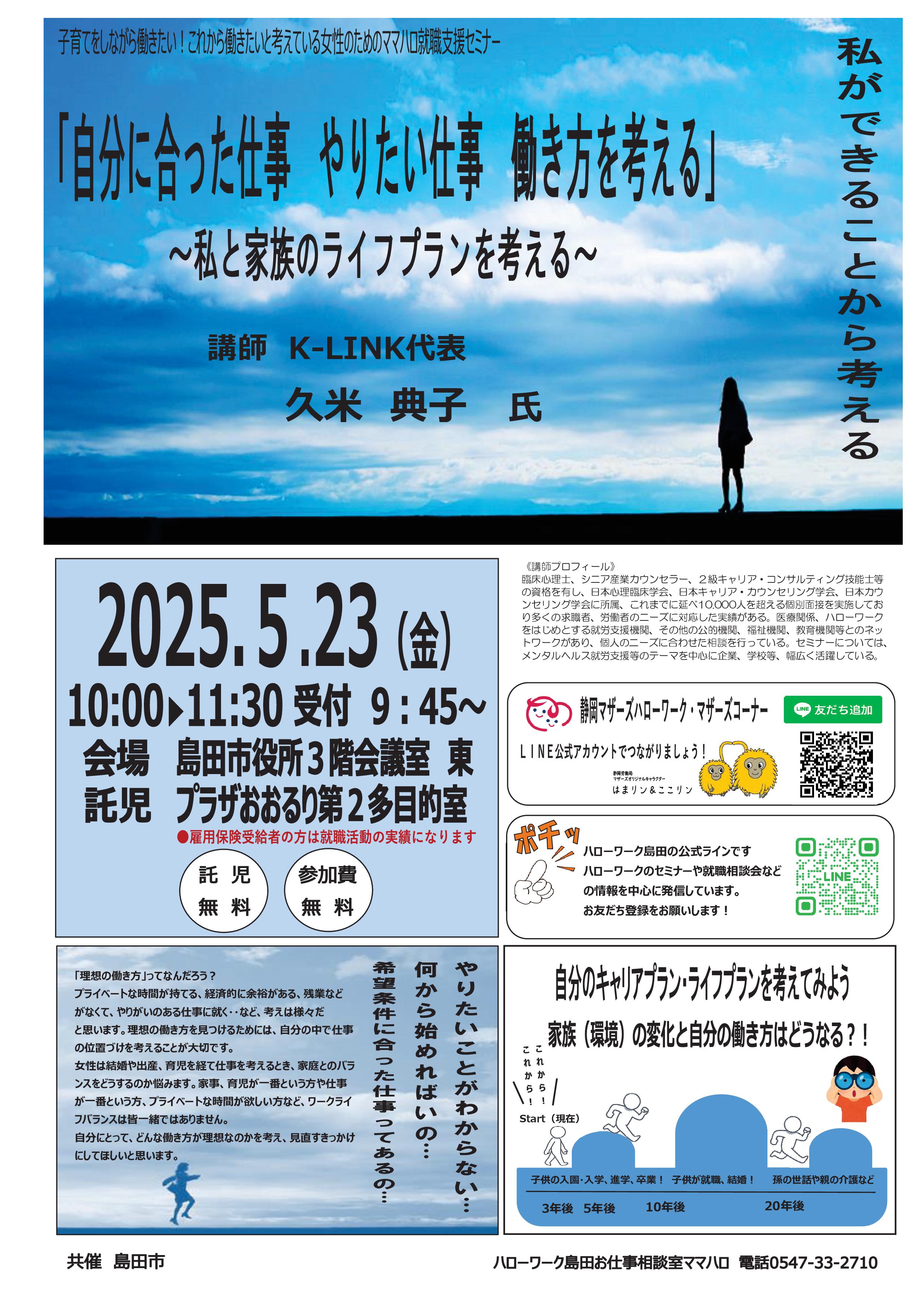 申込方法は、ママハロまたは、ハローワーク島田紹介窓口へ参加申込書を提出していただくか、お電話でお申込ください。