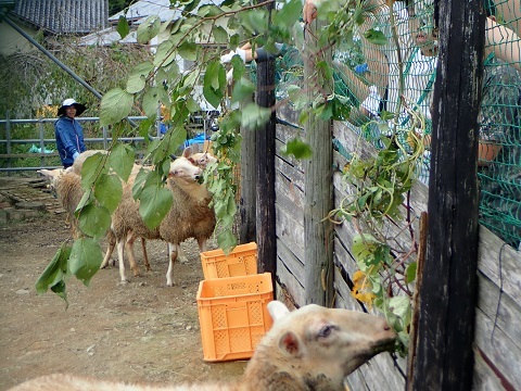 午後には、旧伊久美小学校の近くの、ヒツジを飼っているお宅へ向かい、エサやり体験をさせていただきました。サツマイモのツルや、クワの葉を差し出すと、ヒツジたちが寄ってきました。臆病なヒツジも多く、ツルや枝を少し動かすと逃げて行ってしまいましたが、全く怖がらないヒツジもいて、おいしそうに葉を食べていました。
