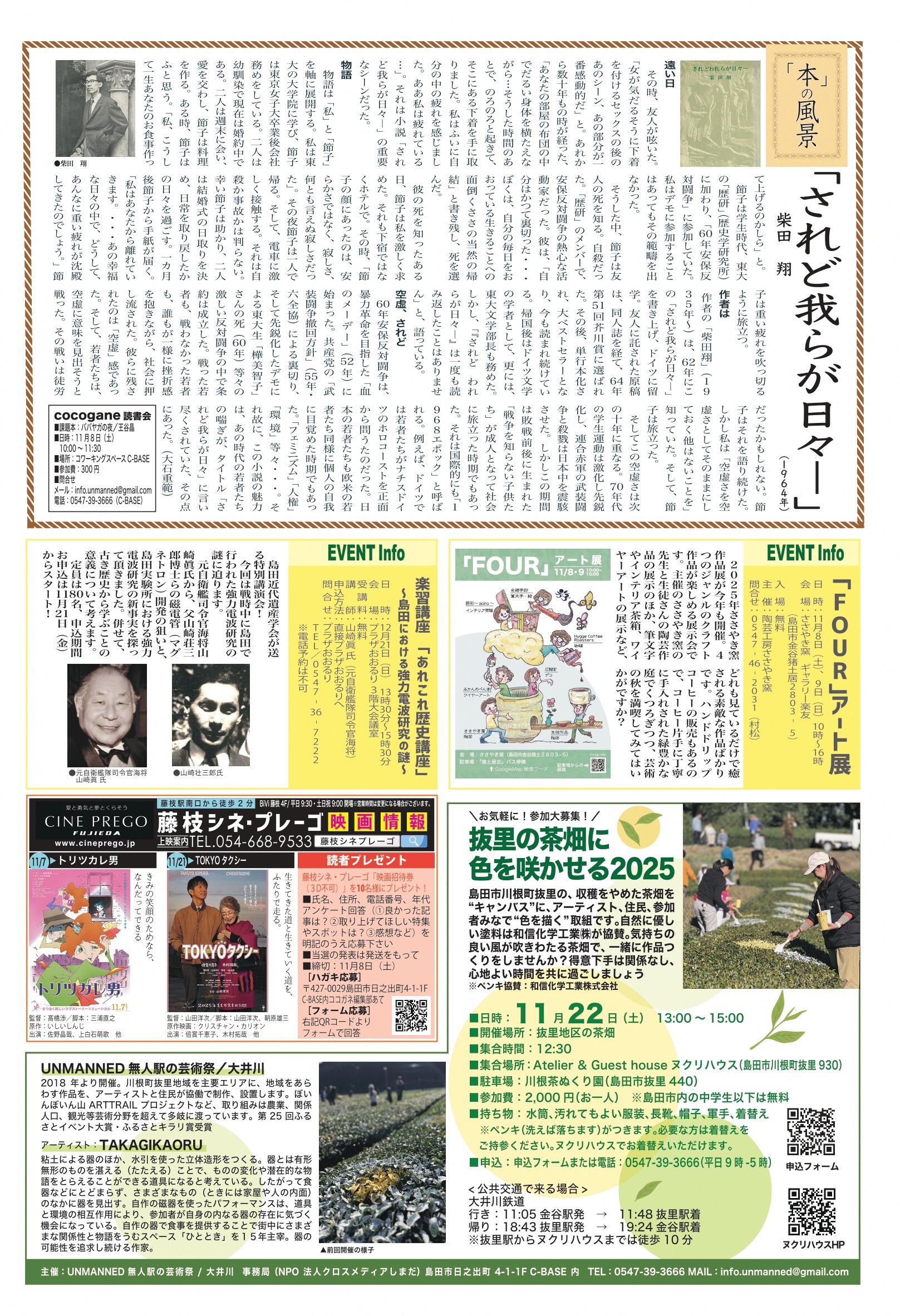 イベントインフォメーションには、毎年人気の金谷にあるささやき窯さんの展示会の紹介や、島田近代遺産学会の興味深い講座のご紹介のほか、島田市川根の抜里エリアで開催の「抜里の茶畑に色を咲かせる」イベントの参加者募集のご案内や、15周年となる「luxury salon SATINE」さんのご紹介など、今回も盛りだくさんの内容となっています。