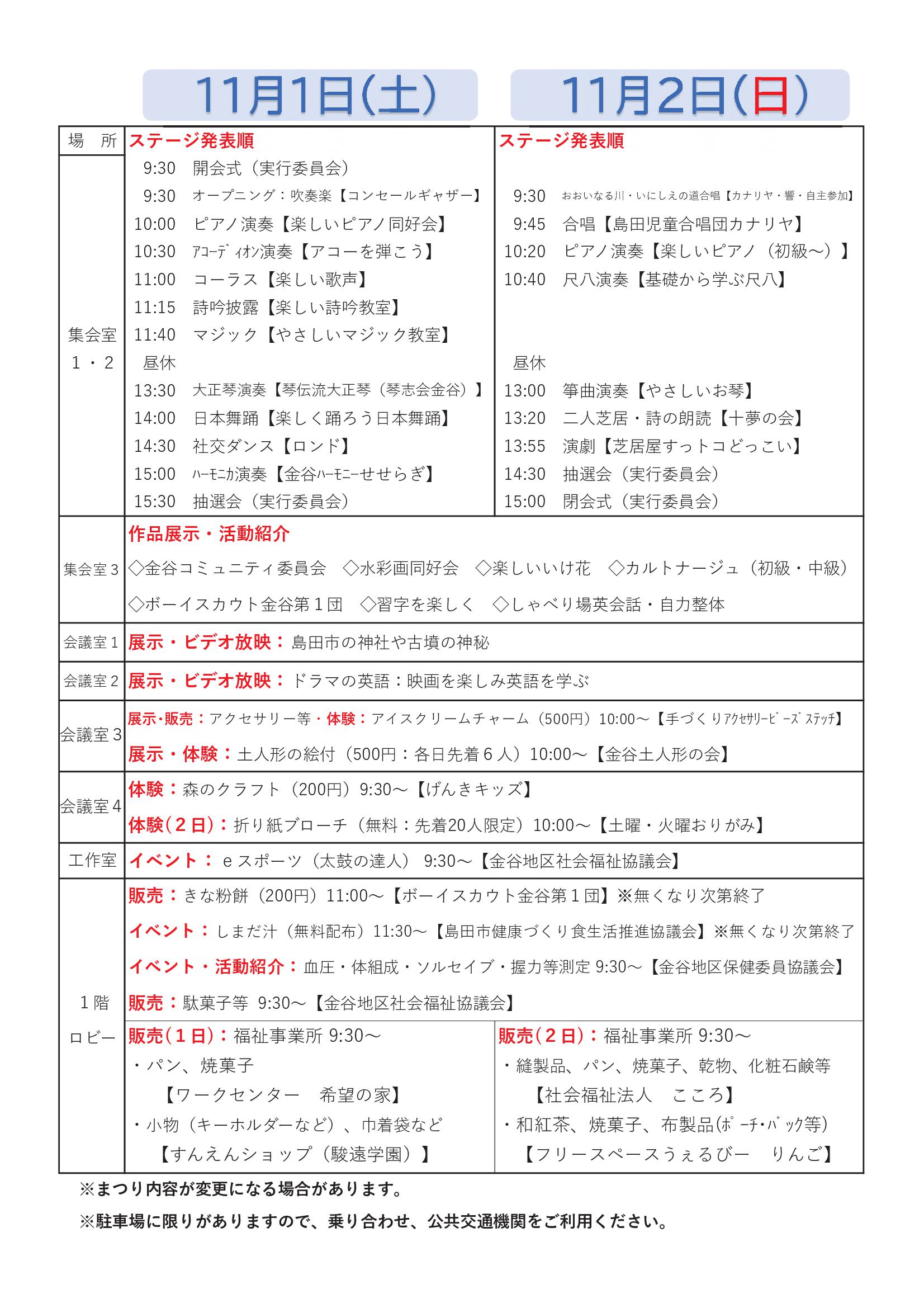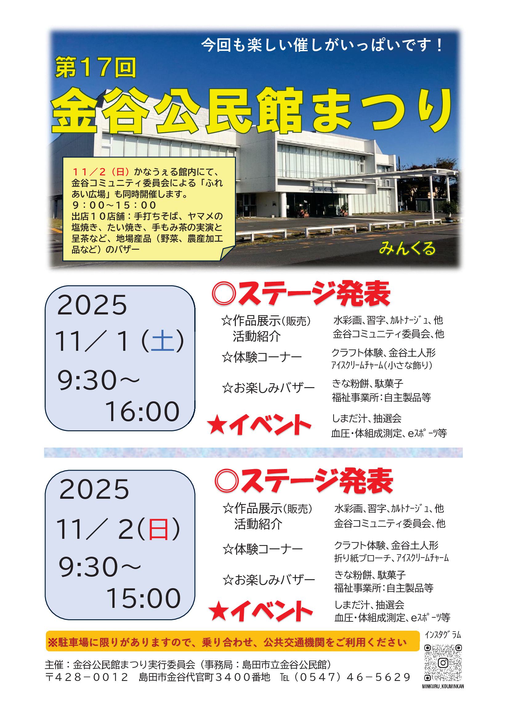 令和7年11月1日(土)、2日(日)の2日間、金谷公民館(みんくる内)で金谷公民館まつりが開催されます。