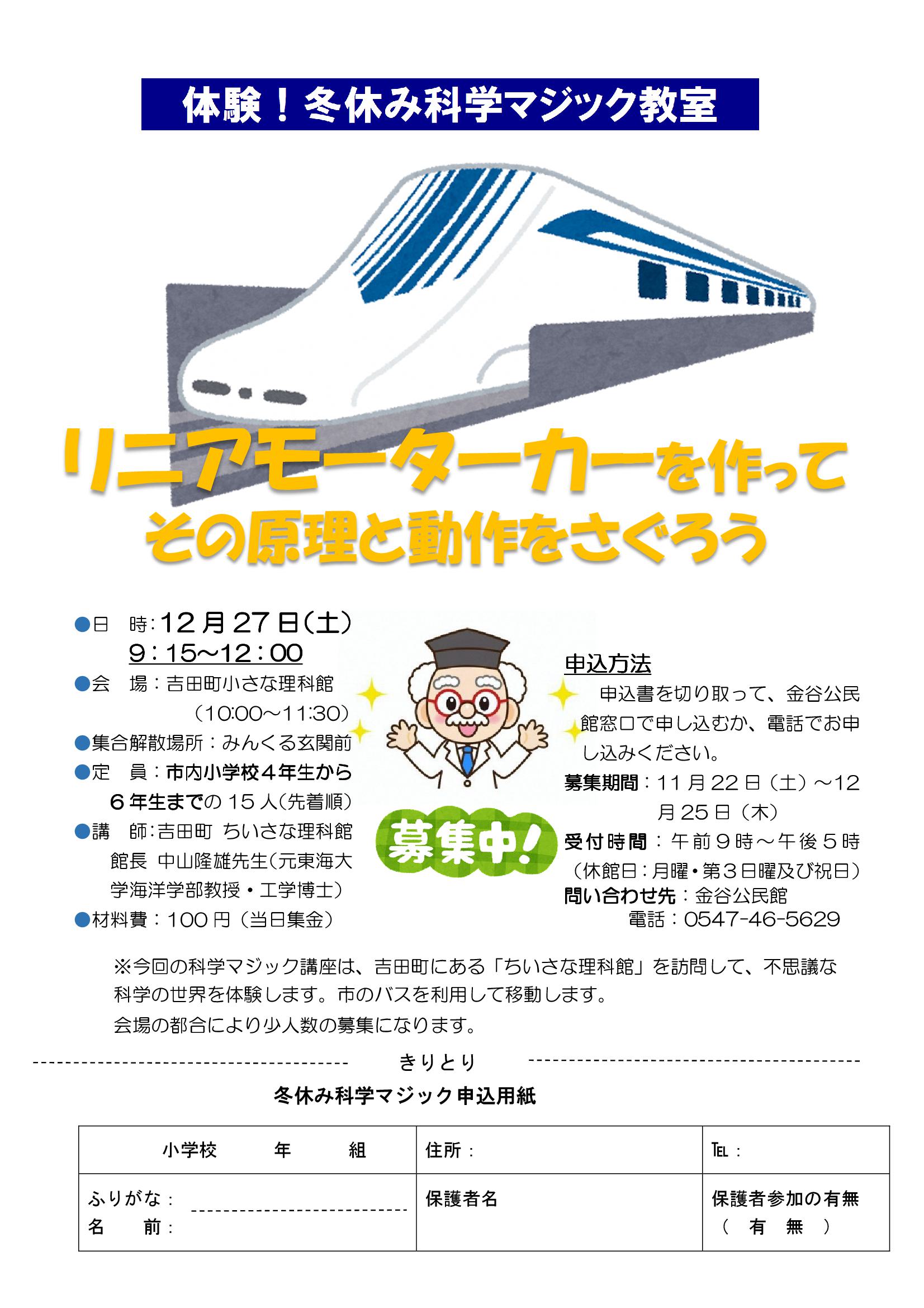 ※今回の科学マジック講座は、吉田町にある「ちいさな理科館」を訪問して、不思議な科学の世界を体験します。