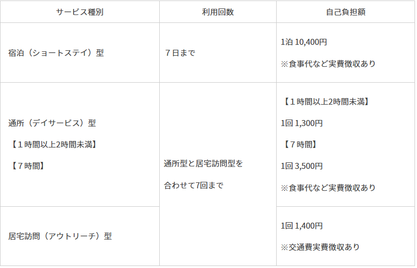 宿泊(ショートステイ)型の利用回数が変更になりました。また、自己負担額が変更になっている種類があります。ご注意ください。