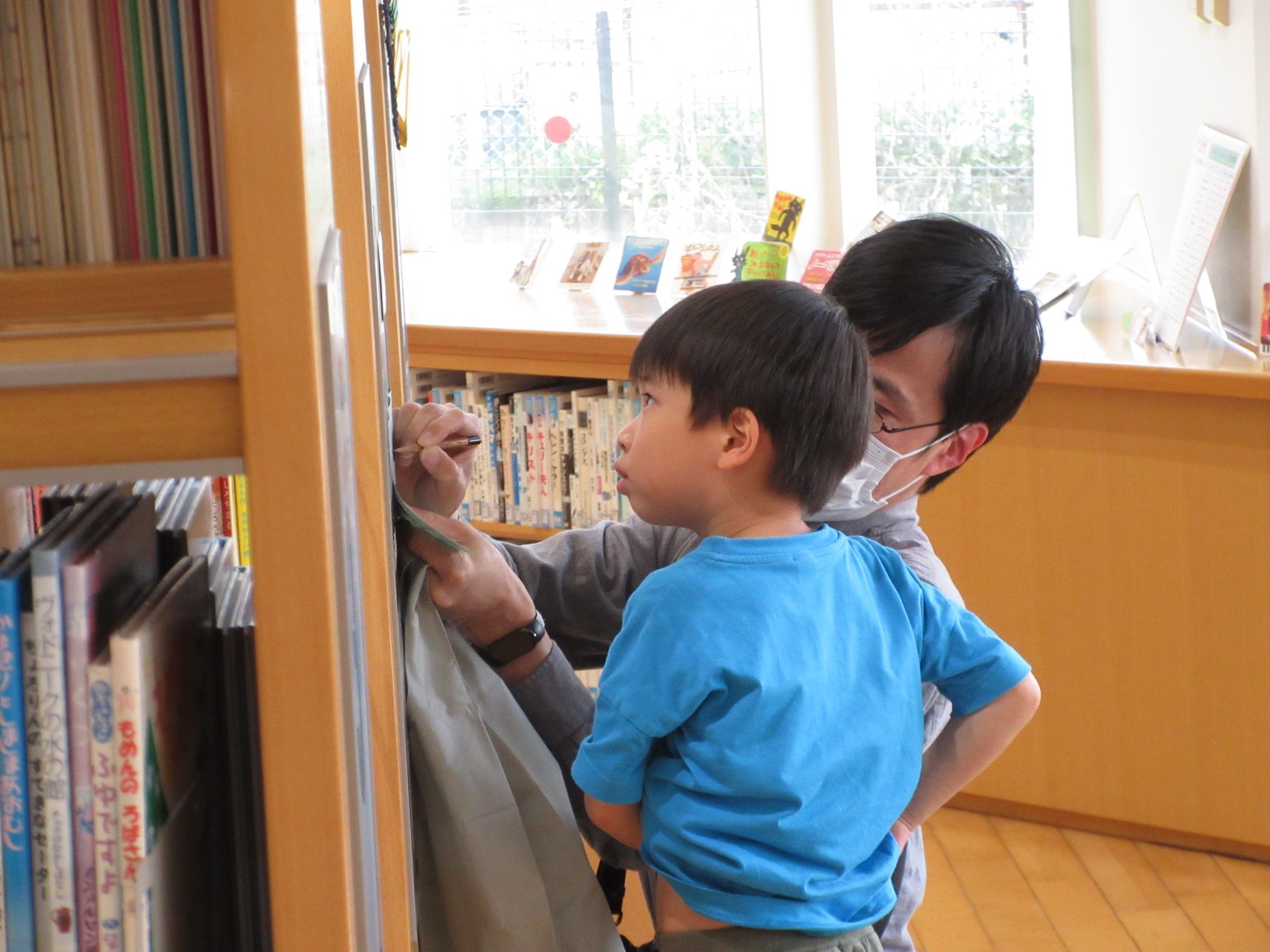 児童の書架(棚)にかくれている、5枚の「クローバーカード」をさがして、そこに書いてある言葉を書いて集めるゲームです。
