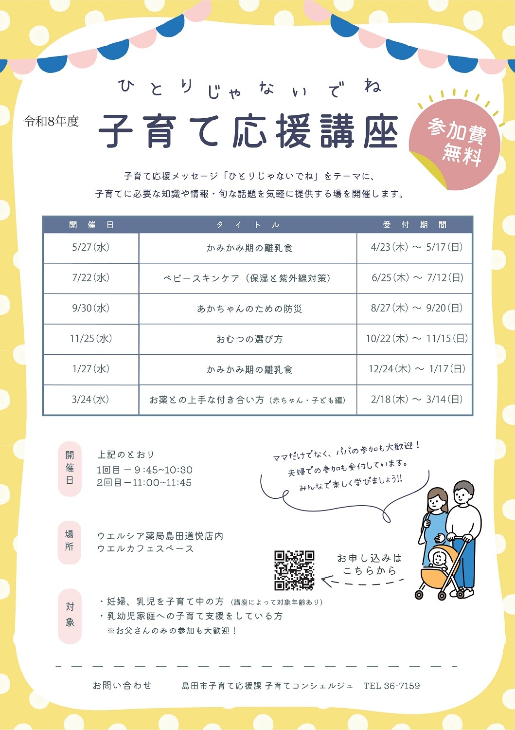 子育てに必要な知識や情報、旬な話題をテーマに講座を開催します。講座といっても、お子さんと一緒に参加OK。約1時間程度の講座になっています。興味がある講座に参加して、子育て情報をゲットしましょう!ママの参加だけでなく、パパの参加も大歓迎!夫婦での参加も受付しています。みんなでたのしく学びましょう!