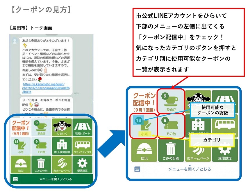 市公式LINEアカウントをひらいて下部のメニュー(リッチメニュー)の左側に出てくる「クーポン配信中」を確認してください。